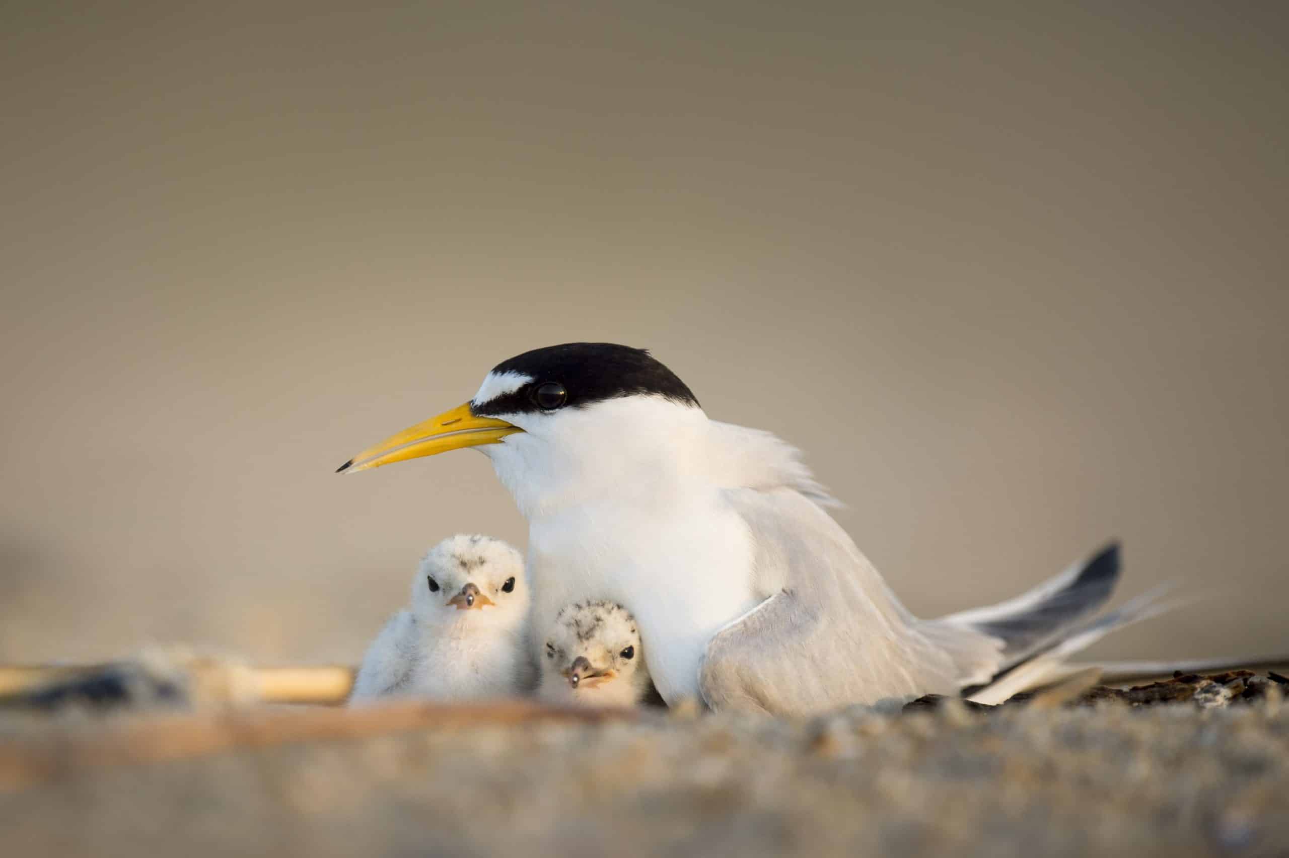 In Florida the Least Tern is a state-designated threatened species. It is protected under the Florida Endangered and Threatened Species Rule as well as the U.S. Migratory Bird Treaty Act. The main reason for the Least Terns’ decline in numbers is the loss of quiet sandy beaches. Stronger coastal storms and the exceptionally high tides they bring result in the loss of suitable nesting sites. Factors within our control are the amount of development along the coast bringing increased human interactions on the beach. The Least Terns do not like to be disturbed and when distressed may abandon their nests. Disturbances come in many forms: animals chasing the birds, people walking through groups of birds, or walking too close to an unseen nest. On beaches with actively nesting bird populations, you may see an area roped off to protect the birds, their eggs, and the chicks. We can share the beautiful beaches with these little birds by taking care in where we step: