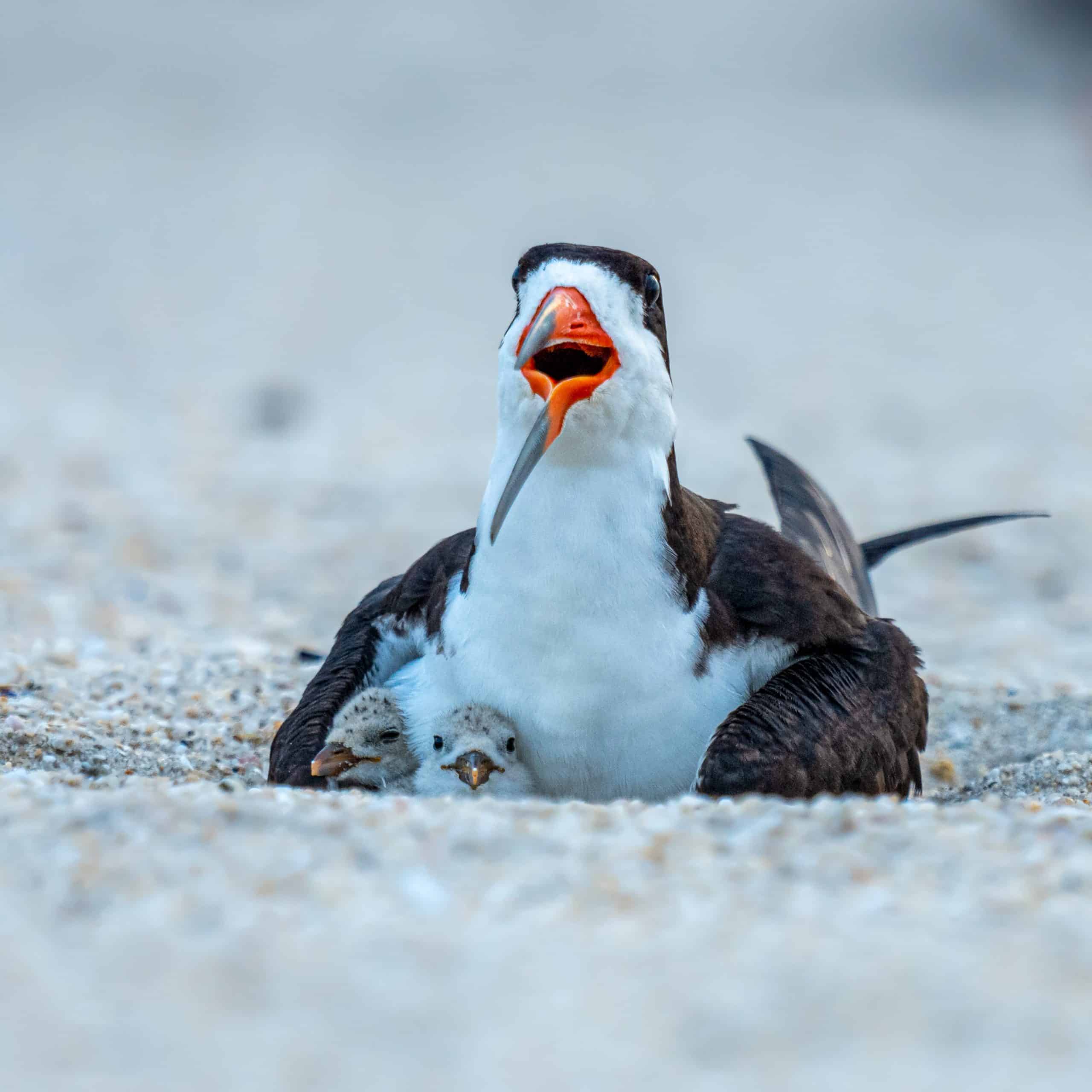 It’s hard to miss the adults with their black and white body and bright orange and black bill. The chicks and eggs are hard to see in the sand because of their tan and spotted color. Keep your distance and watch your step. These spectacular birds have adaptations like no other. First, their lower mandible is longer than the upper, allowing the bird to skim its beak in the shallow water and catch fish. The other adaptation is its large pupil feature and vertical slit (just like a cat’s eye). No other bird has this feature. It has webbed feet but can not swim. There are many organizations that help protect this Florida protected endangered bird.