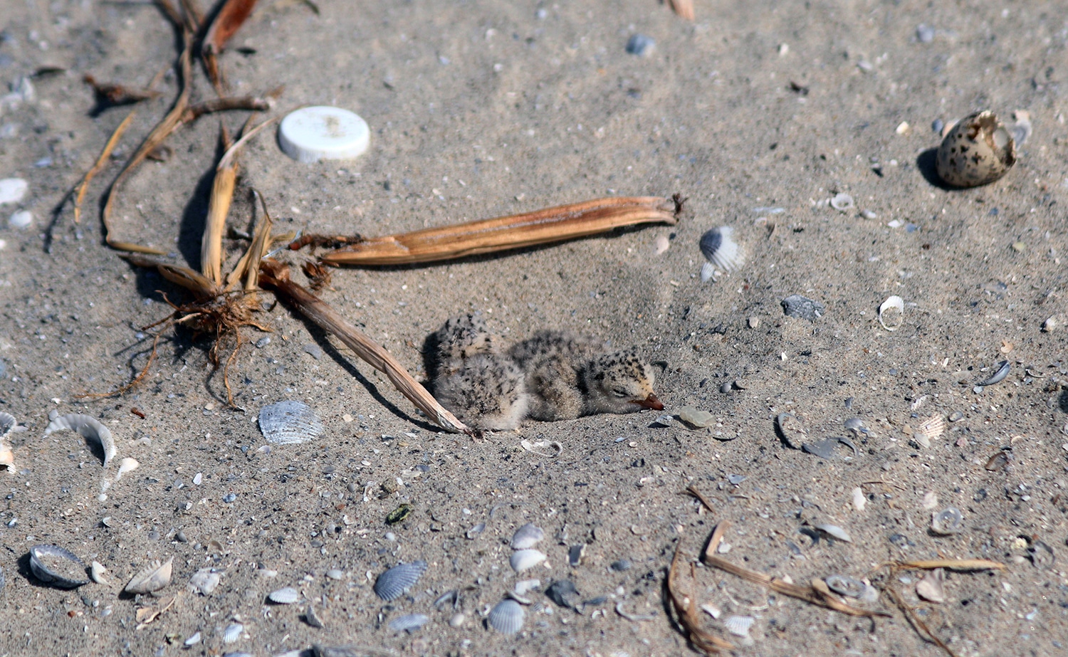 After the courtship a pair will start making a nest. The “nest” is made in the sand by the Tern using its feet to scrape out a shallow bowl-like depression. This is called a scrape. Between mid-April to the first of May, one to three eggs will be laid in the scrape. The eggs have blotches of black, brown, and gray that help camouflage them in the sand. Both parents will incubate the eggs and when it is too hot they will soak their belly feathers in water and drip the water onto the eggs to cool them (they do this for the chicks also). If all goes well, the eggs will hatch in about 3 weeks. Several days after hatching the chicks leave the scrape and hide nearby on the beach. It will be another 3 weeks until the chicks are finally able to fly. During this whole time, they are easy prey for predators and at risk of being stepped on by humans.
